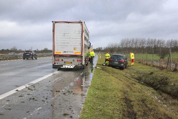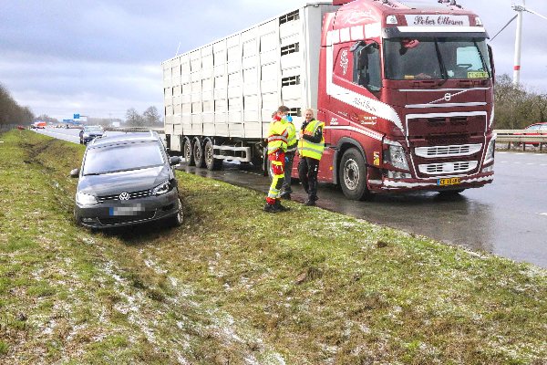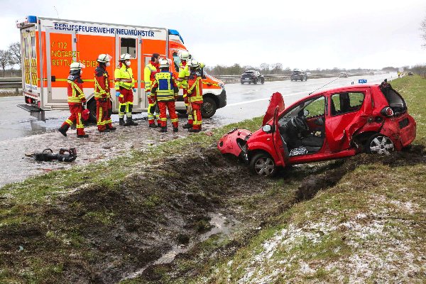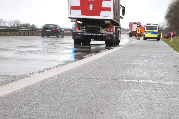 Neumünster: Nach Sturm 4 Glätteunfälle auf A7 – Hagelschauer wird zur Gefahr – Feuerwehr im Dauereinsatz · Text und Fotos: Thomas Nyfeler · Auf der A7 zwischen Neumünster Nord und Dreieck Bordesholm kam es am heutigen Vormittag zu mehreren glättebedingten Unfällen. Die Berufsfeuerwehr Neumünster mit dem Rüstzug, sowie die Freiwillige Feuerwehr Gadeland und der Rettungsdienst rückten zu Einsatzstellen in beiden Fahrtrichtungen aus. Durch einen kurzfristigen Hagelschauer wurde die Autobahn zu einer spiegelglatten Gefahr. Der B-Dienst der Berufsfeuerwehr, Jan Heitmann, stellvertretender Fachdienstleiter der Berufsfeuerwehr Neumünster, fuhr zunächst die Einsatzstellen ab, verschaffte sich einen ersten Überblick und priorisierte. Anschließend wurden die benötigten Rettungskräfte, Rüstzug, RTW und NEF, zugeführt. Die vier Unfälle verliefen dabei jedoch glimpflich, alle Personen wurden nur leicht verletzt.