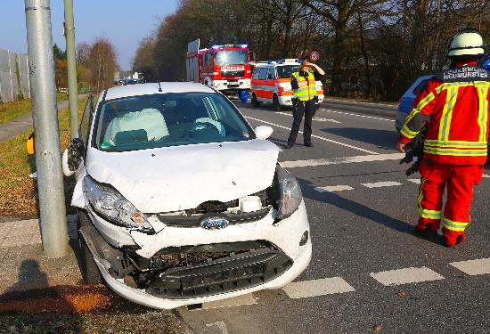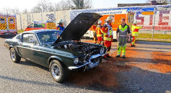 Neumünster: Verkehrsunfall mit einem Mustang „Oldtimer“ · Ort: Neumünster, Altonaer Straße Ecke Oderstraße · Datum: 17.02.2018, ca. 13:10 Uhr · Fotos und Text: Tom Nyfeler – Unfall an Kreuzung – Hoher Sachschaden – 2 leicht Verletzte und ein mittelschwer Verletzter. Neumünster – (Tom Nyfeler) Auf der Ecke Altonaer Straße Oderstraße kam es am Sonntagnachmittag gegen 13:10 Uhr zu einem schweren Unfall mit zwei beteiligten PKW. Ein Fort mit Hamburger Kennzeichen wollte in die Oderstraße abbiegen und übersah dabei wohl einen stadteinwärts fahrenden Mustang Oldtimer aus dem Kreis Segeberg. Beide Fahrzeuge kollidierten, es entstand ein hoher Sachschaden. Bei dem Unfall wurden zwei Personen leicht und eine Person mittelschwer verletzt, zwei RTWs sowie ein Notarzt betreuten die Verletzten und brachten sie ins Krankenhaus. Die Berufsfeuerwehr Neumünster streute auslaufende Betriebsstoffe ab, die Polizei sperrte den Kreuzungsbereich komplett, der nachfolgende Verkehr wurde umgeleitet. Auf dieser Kreuzung ist vorletzte Woche erst ein schwerer Unfall passiert.
