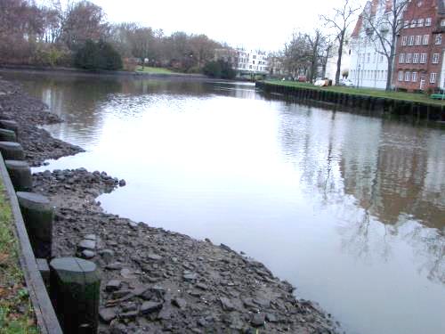 Fotos: TBF/Holger Kröger– An der Nordseeküste herrschte Sturmflut, in Lübeck extrem niedriges Wasser an der Obertrave – wie so oft in dieser Jahreszeit drückte der starke Südwestwind das Wasser aus Trave und Stadtgraben hinanaus in die Ostsee, an vielen Stellen kam so der Grund zum Vorschein. (Beispiel: Wie im Foto an der Lachswehrbrücke). „Weitere Bilder >>>!“ Der Wind liess heute nach und der Wasserstand stieg wieder an. Wenn man den Berechnungen des Bundesamtes für Schifffahrt und Hydrografie Glauben schenken will, soll morgen (Sonntag) in Lübeck wieder ein leicht erhöhter Wasserstand vorhanden sein.