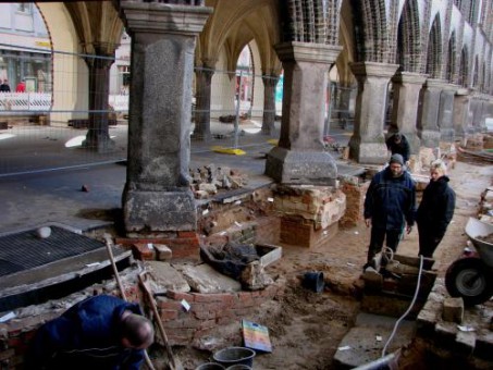 Fotos: TBF/Holger Kröger – Nun sind die Archäologen im Zuge der Aus- und Neuarbeiten in der Breiten Strasse auch am Markt angelangt. Vor ein paar Wochen wurden am Germanistenkeller, direkt neben dem Rathaus, Befestigungswände angelegt. Nun wird fleissig auf der anderen Seite, zur Marktseite hin gebaut. doch vorher sind nun die Archäologen angerückt und graben nach Schätzen aus der Blüte der Hansezeit.