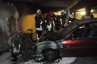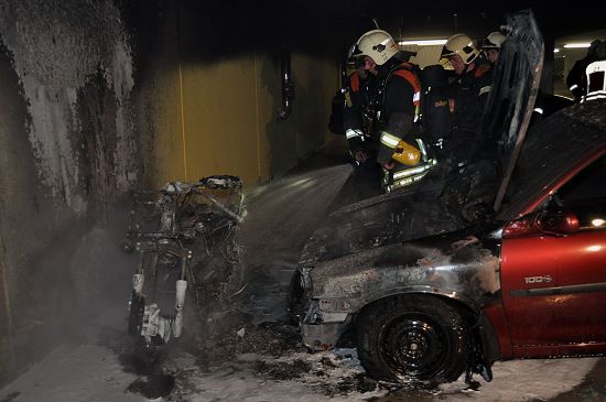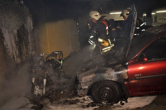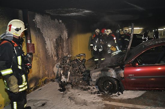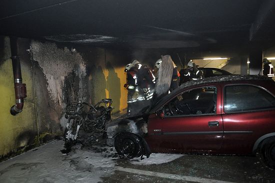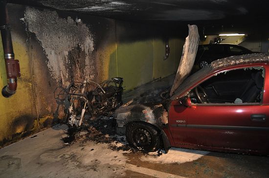 Offenbar Brandstiftung in Tiefgarage: PKW und Motoroller brennen