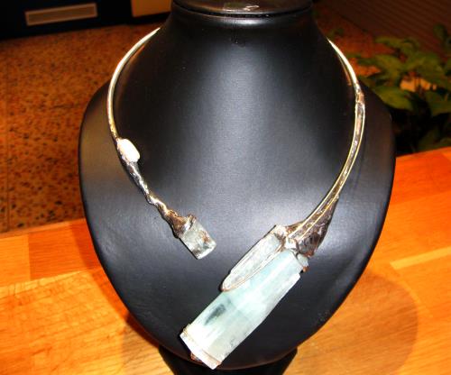 Hierbei handelt es sich um einen silbernen Halsschmuck mit zwei Aquamarin-Steinen und einer Perle. Das Kollier ist nach vorn geöffnet. Sein Wert beträgt knapp 400 Euro.