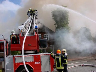 Fotos: TBF/Holger Kröger – Am Mittwochvormittag, 13. Juni 2012, brannten in Grube zwei Einfamilienhäuser. Dabei wurde glücklicherweise niemand verletzt. Es entstand aber erheblicher Sachschaden. Gegen 10.45 Uhr hatte ein Anwohner eine starke Rauchentwicklung in einem Haus in der Hauptstraße festgestellt. Polizei und Feuerwehr wurden alarmiert. Da es zu einer erheblichen Rauchentwicklung kam, wurde eine Rundfunkdurchsage veranlasst und die Hauptstraße von den Straßen Wendorf bis Fährkamp gesperrt, damit die Rettungskräfte problemlos arbeiten konnten. Später wurde eine Umleitung eingerichtet.Nach ersten Ermittlungen entstand das Feuer im hinteren Teil eines Hauses. Von dort breitete es sich weiter aus und griff auf ein daneben stehendes Haus über. Beide Häuser wurden durch das Feuer stark beschädigt.