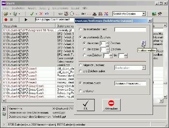 Ersetzen und Entfernen: Mit dieser Funktion ist es möglich, beliebige Zeichen oder Zeichenketten in den markierten Dateien gegen einen neuen Text auszutauschen. Bei dieser Vorgehensweise lassen sich also Teile des Dateinamens sozusagen „mikrochirurgisch“ verändern. Ebenso ist es möglich, Zeichen nachträglich in einen Namen einzufügen oder bestimmte Namensbestandteile innerhalb des Dateinamens zu verschieben.