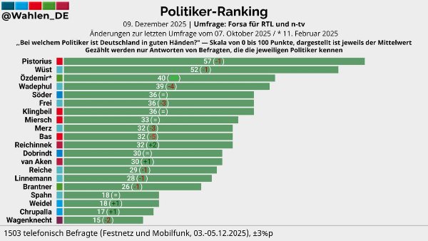 WeiterlesenUmfrage Forsa/RTL/n-tv Skala von 0 bis 100 Punkte (Mittelwert)