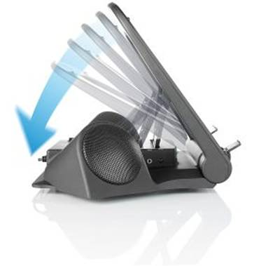 Auch die technische Premium-Ausstattung des Notebooks-Staenders ist jeden Blick wert: Die USB-Lautsprecher verwoehnen mit einer digitalen Klangperformance, auch bei Netbooks mit eher schwachem Soundchip. Per Knopfdruck hat man dabei die Lautstaerke bequem im Griff.