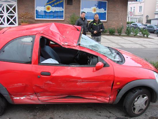 VU Schwartauer A.. 002Fotos: TBF/Holger Kröger – Lübeck (ots) – Am Freitagmorgen (21.11.2104) ereignete sich in der Schwartauer Allee ein Verkehrsunfall, bei dem sich ein PKW überschlug und auf dem Dach liegen blieb. Ein 62 Jahre alter Verkehrsteilnehmer fuhr gegen 09.20 Uhr mit seinem roten Opel die Drögestraße entlang, um von dort aus anschließend nach links in die Schwartauer Allee einzubiegen. Hierbei übersah der Lübecker offensichtlich den von links auf der Schwartauer Allee herannahenden Ford Ka eines 27-jährigen Mannes aus Bad Schwartau.Beide Fahrzeuge stießen ungebremst zusammen. Durch die Wucht des Aufpralls wurde der Ford Ka gegen den Kantstein am rechten Fahrbahnrand geschleudert. Hier überschlug sich das Fahrzeug, kollidierte mit einem weiteren neben der Fahrbahn parkenden PKW und blieb anschließend auf dem Dach liegen.