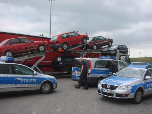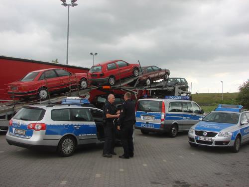 Fotos: TBF/Holger Kröger – Lübeck (ots) – Die ersten Informationen klangen spektakulär als gegen 11.45 Uhr der 45-jährige lettische Berufskraftfahrer der Lübecker Polizei mitteilte, dass jemand gerade mit seinem Autotransporter in Richtung Osten weggefahren sei. Der 45-Jährige ist Fahrer einer lettischen Spedition und hatte zuvor sechs Pkw der Marken Audi und VW abgeholt, die sein Chef dort gekauft hatte. Da der Transporterfahrer nun Richtung Heimat unterwegs war, bat ihn der Spediteur auch noch seinen 21-jährigen Sohn mitzunehmen, der momentan in Dänemark studiert. Der Fahrer stellte den Transporter in Lübeck ab, mietete sich einen Opel Corsa und holte den 21-jährigen Spediteurssohn aus Dänemark nach Lübeck.Als der Lkw-Fahrer den Leihwagen jetzt am Dienstag, gegen 11.45 Uhr, wieder abgeben wollte, machte er noch einen Tankstopp an einer Tankstelle an der Geniner Straße. Hier staunte der 45-Jährige nicht schlecht, als plötzlich sein beladener Transporter vorbeifuhr. Der Fahrer informierte die Lübecker Polizei und die Regionalleitstelle setzte gleichfalls die Polizeien der Nachbarländer in Kenntnis.