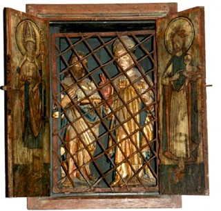 Aus dem Schränkchen, das mit einem Metallgitter gesichert war und einer Höhe von 1,60 Metern hängt, wurde lediglich die eine Holzfigur entwendet, die andere blieb dort stehen.