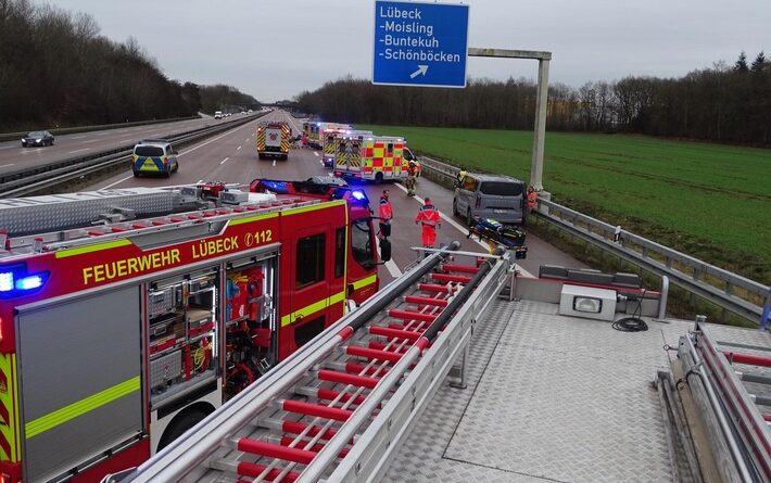 Am Freitagmittag (19.12.2025) kam es im Bereich der Autobahnausfahrt Moisling zu einem Auffahrunfall mit fünf Beteiligten Kraftfahrzeugen und drei leicht verletzten Personen. Es entstand ein hoher Sachschaden an den Fahrzeugen. Die Bundesautobahn 1 in Richtung Ostholstein wurde für die Rettungs- und Bergungsmaßnahmen gesperrt.