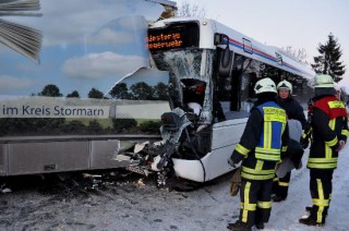 Die Feuerwehr ist gerade dabei, einen eingeklemmten Busfahrer zu befreien. Nach ersten Erkenntnissen soll er leicht verletzt sein. Der zunächst angeforderte Rettungshubschrauber Christoph 12 konnte wieder zurückfliegen. Nach bisherigem Stand waren die beiden Busse zunächst von Lübeck aus in Richtung Bad Oldesloe (Kreisstraße 7) gesehen unterwegs. Aus bisher ungeklärter Ursache fuhr der Fahrer eines Linienbusses (Alter d. Fahrers und Anzahl Fahrgäste noch n icht bekannt) auf einen Bus der Fahrbücherei des Kreises auf. Der Fahrer des Linienbusses ist eingeklemmt. Der Fahrer des Büchereibusses konnte leicht verletzt aussteigen. In dem Büchereibus war noch eine Mutter zusammen mit ihren beiden Kindern. Die drei trugen leichte Verletzungen davon. Sie mussten nicht in ein Krankenhaus gebracht werden. Die Polizeibeamten leiten den Verkehr momentan örtlich um. Zu Verkehrsbehinderungen ist noch nichts bekannt.