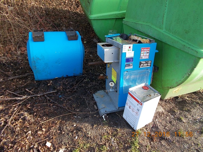 Bad Segeberg (ots) – Am 27.12.16 sind in einem unbefestigten Wirtschaftsweg im Bereich der Tankstedter Straße unterhalb der Autobahn 23 in Rellingen, eine Gasheizung und ein Kanister Altöl festgestellt worden, die neben einem Altglas und Altpapiercontainer unzulässig entsorgt worden sind. Es handelt sich um ungefähr 20 Liter Altöl in einem Metallkanister sowie um eine Gasheizung mit Kessel der Marke Buderus. Die Gegenstände wurden vermutlich in der Zeit vom 23.12.16 bis 27.12.16 dort abgelagert. Das Polizei-Autobahn- und Bezirksrevier Pinneberg hat die Ermittlungen aufgenommen und bittet Zeugen und Hinweisgeber, sich unter der 04101/2020 zu melden. Polizeidirektion Bad Segeberg – Pressestelle – Dorfstr. 16-18 23795 Bad Segeberg Peggy Bandelin Telefon: 04551/884-2024 E-Mail: pressestelle.badsegeberg@polizei.landsh.de Original-Content von: Polizeidirektion Bad Segeberg, übermittelt durch news aktuell