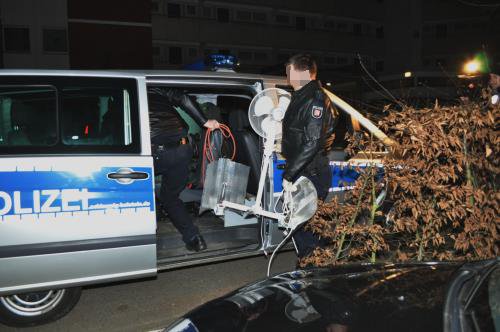 Fotos: TBF/Holger Kröger – 01.02.2012 – 13:18 Uhr, Polizeidirektion Lübeck Lübeck (ots) – Eigentlich sollte es am späten Dienstagabend, 31. Januar 2012, ein Routineeinsatz für die Beamten des 2. Polizeirevier Lübecks wegen einer Ruhestörung werden. Doch dann entdeckten die Kollegen eine kleine Hanfplantage in der Wohnung. „siehe weitere Fotos>>>!“ Ein Anwohner im Stadtteil Buntekuh hatte sich gegen 22.30 Uhr bei der Polizei über erheblichen Lärm aus einer anderen Wohnung im Hochhaus beschwert. Als die Kollegen an der Tür der besagten Wohnung standen, sahen sie zunächst, dass eine zur Wohnung gehörende Fensterscheibe eingeschlagen war. An der geöffneten Wohnungstür trafen sie dann auf einen 24-jährigen Lübecker, der ebenfalls in dem Haus, in einem anderen Stockwerk, wohnt. Er machte fragwürd ige Angaben, so dass die Beamten weiter in die Wohnung hinein gingen, um den Sachverhalt vollständig zu klären. In der 1 ½ -Zimmer-Wohnung trafen die Beamten dann nicht nur auf einen weiteren Mann, sondern stießen auch auf diverse Hanfpflanzen und verschiedene Gegenstände, die für die Aufzucht und Weiterverarbeitung solcher Pflanzen nötig sind.