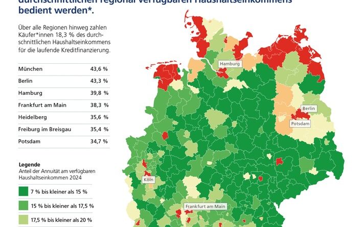 25 Prozent der deutschen Haushalte leben dagegen in einer von 56 Regionen mit im Vergleich sehr hohen Kaufpreisen. Dort müssen mindestens 25 Prozent des durchschnittlichen regional verfügbaren Haushaltseinkommens für die laufende Kreditfinanzierung eingesetzt werden. Im Vergleich zum Vorjahr hat sich die Lage hier jedoch leicht entschärft: 2023 waren es noch 27 Prozent der Haushalte in 69 Regionen.