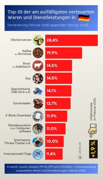 Obstkonserven haben sich im Februar in der Bundesrepublik im Vergleich zum Vorjahresmonat (Februar 2025) laut Angaben des Statistischen Bundesamtes am meisten unter den von der Behörde ausgewählten Waren und Dienstleistungen verteuert. Was nun wegen der Verteuerung in #Deutschland zu Luxus geworden zu sein scheint, ist in der folgenden Infografik zu sehen.