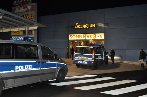Text und Fotos: TBF/Holger Kröger – Heute am späten Abend kam es auf dem Plaza-Gelände im Stadtteil Buntekuh in einem Solarium zu einem Raubüberfall, bei der eine Angestellte überfallen und beraubt wurde. 2 maskierte Männer stürmten in das Solarium und richteten eine Waffe auf die Frau. Geistesgegenwärtig konnte sich die Frau in einem Raum einschliessen und verständigte die Polizei.Die Beamten leiteten eine Grossfahndung ein, bisher fehlt allerdings jegliche Spur der Täter.