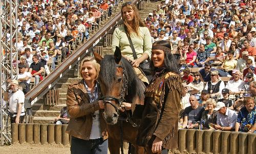 Bildunterschrift: Vor vollbesetzten Zuschauerrängen im Freilichttheater am Kalkberg überraschte die Geschäftsführerin der Karl-May-Spiele, Ute Thienel (links), Renate Martens mit einem besonderen Geschenk, der 10-jährigen Stute „Joy“. Rechts im Bild Reiter-Statistin Kristin Höppner.