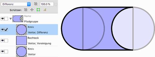 Das folgende Beispiel zeigt eine Pfadgruppe mit zwei Kreisen und dazwischen einem Rechteck. Der linke Kreis und das Rechteck wurden vereinigt und vom Ergebnis wurde der rechte Kreis abgezogen. Die ursprünglichen Vektorebenen sind schwach gezeichnet, das Ergebnis stark: