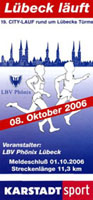 Sind Sie fit und haben Sie Lust, Lübeck einmal auf eigenen Füßen zu umrunden? Dann sind Sie herzlich willkommen beim 19. City-Lauf Lübeck am 08. Oktober. Sei es allein oder in der Gruppe, als Einsteiger oder austrainierter Langstreckenläufer: Laufen macht einfach Spaß! Wer seine Lauf-Fitness unter Beweis stellen möchte, der kann sich noch bis zum 01. Oktober für den Hauptlauf über die Distanz von 11,3 km anmelden. Natürlich steht bei dieser sportlichen Veranstaltung immer der Spaß am Sport und das gemeinsame Erleben im Vordergrund. Der 19. City-Lauf „Rund um Lübecks Türme“ wird nach den Bestimmungen des Deutschen Leichtathletikverbandes durchgeführt. Der Lauf ist offiziell genehmigter Volkslauf 2006.