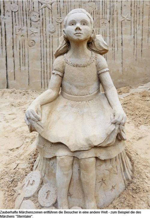 Zauberhafte Märchenszenen entführen die Besucher in eine andere Welt – zum Beispiel die des Märchens „Sterntaler“. Vom 3. Juni bis Ende Oktober 2020 können die Besucher mit einer Tageskarte die Ausstellung besichtigen, die aktuell in großen Hallen mit 4.000 qm überdachter Ausstellungsfläche erbaut wird: Dort werden nach der Eröffnung mehr als 80 Skulpturen in 30 Szenen zu bestaunen sein. Damit bietet Travemünde erneut eine der größten, überdachten Sandskulpturen-Ausstellungen in Deutschland. Eine Gastronomie mit mehreren, getrennten Kinderspielplätzen und eine Sammlung von über 300 Sandarten runden die Sandskulpturen-Ausstellung ab. Sie ist am Fischereihafen „Auf dem Baggersand“ zu finden.