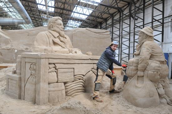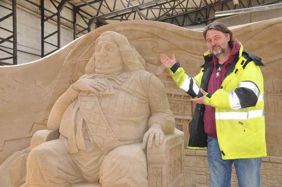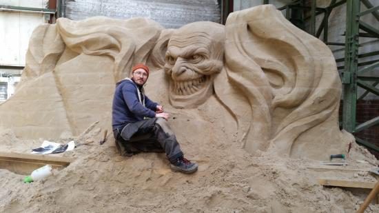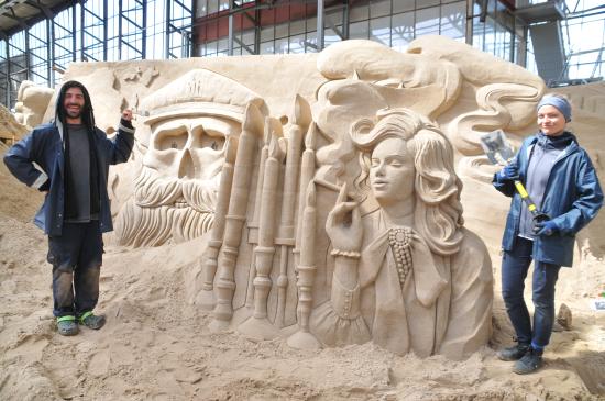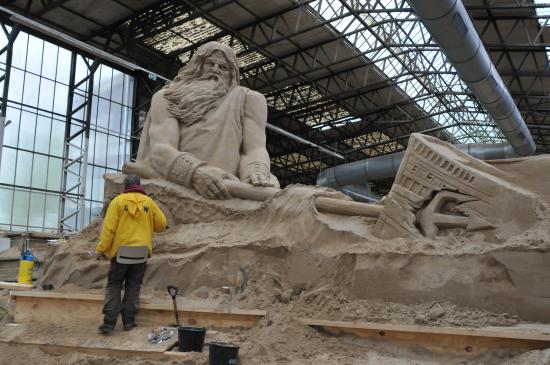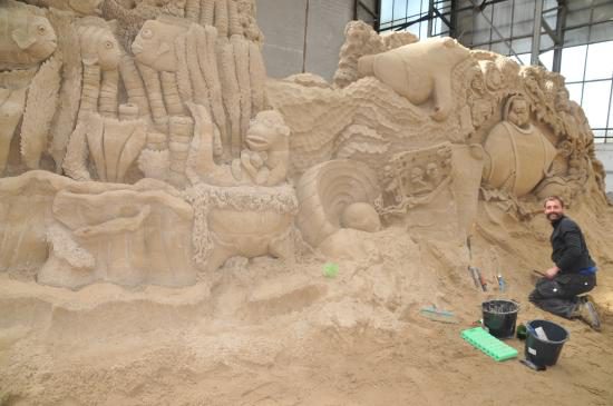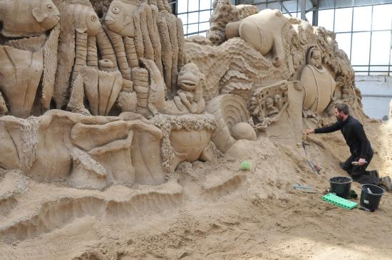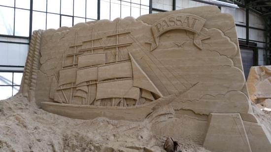 Text und Fotos: TBF/Holger Kasnitz · Sandskulpturen-Ausstellung in Travemünde 2019 · In diesem Jahr findet die Sandskulpturen-Ausstellung vom 11. Mai bis zum 20. Oktober 2019 in Travemünde in einer großen Bootshalle der Böbs-Werft GmbH statt. Nicht mehr im Freien, sondern vor Sturm und Regen geschützt. Es ist die einzige in Schleswig-Holstein und eine der größten überdachten Sandskulpturen-Ausstellungen in Deutschland. Hier erarbeiten 25 internationale Sand-Künstler aus 11 verschiedenen Ländern beeindruckende Skulpturen. Rund zwei Wochen benötigen die sogenannten „sand carver“ (Deutsch: Sandschneider), um die etwa 10.000 Kubikmeter Sand zu verarbeiten.