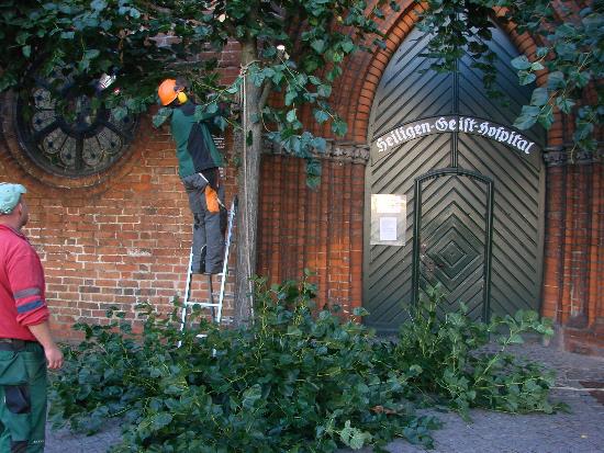 Fotos: TBF/Holger Kröger – Diesmal geht es um die Sanierung der schiefen Türme des Hospitals, das über 600 Jahre alt ist. Durch Absackungen des Bodens durch lange Zeit hindurch, sind unter anderem die Türme des Hospitals am Giebel schief geworden. Jetzt beginnt die Sanierung und dafür muss das Gebäude von außen vollständig mit einem 3D-Scanner erfasst werden.Um die Schäden beurteilen zu können, wird ein genaues Bild der Fassade benötigt, vorher, siehe bilder, mussten 8 Bäume weichen. Was die Technik so alles bewirkt, hätte vor einigen jahren das nachzeichnen der Fassade rund sechs Monate gebraucht, um jeden Stein aufzuzeichnen, gibt es inzwischen die moderne Variante: Ein Laser erfasst alles in einem 3D-Bild, dsann wir es vermessen und mit Fotografien hinterlegt. Rund eine Woche wird Ingenieur Lars Sörensen aus Berlin dafür benötigen. In Kürze werden die Gerüste aufgestellt.