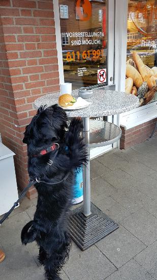 Der reckt sich nach einem leckeren, belegtes Brötchen, das da ganz „alleine“ auf dem Tisch ganz weit aus und will es sich schnell und unbemerkt ganz toll schmecken lassen und da ist doch glatt die Leine zu kurz. Pfui!