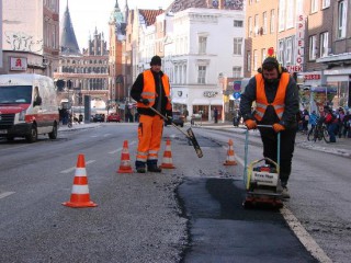 Fotos: TBF/Holger Kröger – Der Winter fordert seinen Tribut, auch in Lübeck. Schlaglöcher über Schlaglöcher, wie hier in Lübecks „Prachtmeile“, der Holstenstrasse, mitten in der Innenstadt. Kein schönes Bild für Touristen! Doch die Stat tut etwas dagegen und läßt die Schlaglöcher ausbessern.