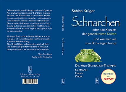 Anti-Schnarch-Therapie von S. Krüger, Foto E. Janssen + Felicitas Hübner Verlag – Westerland/Sylt (pts018/06.09.2011/10:30) – Die ganz andere, von einigen „Schnarch-Experten“ hin und wieder freundlich belächelte, in Buchform veröffentlichte Anti-Schnarch-Therapie der Autorin Sabine Krüger hat inzwischen vielen Schnarchern und Schnarchopfern zur ruhigen, erholsamen Nachtruhe verholfen. Voraussetzung für die erfolgreiche Durchführung der Selbsthilfe-Therapie ist die Bereitschaft der Schnarcher, sich künftig mit den eigenen Verhaltensweisen, den Lebensgewohnheiten und auch den tagsüber „geschluckten Kröten“ auseinandersetzen zu wollen. Das hört sich komplizierter an, als es ist, und kann sogar den Spaßfaktor im Alltagsleben erhören.Das Buch ist witzig geschrieben, es eignet sich auch hervorragend als Geschenk, als amüsanter, aber durchaus wirksamer „Wink mit dem Zaunpfahl“. Die ungewöhnlichen Lösungsvorschläge der Autorin, das Schnarchproblem endlich in den Griff zu bekommen, sind vielleicht bauernschlau, unwissenschaftlich und spitzfindig, aber sie wirken. Was will der Schnarcher oder die Schnarcherin mehr?
