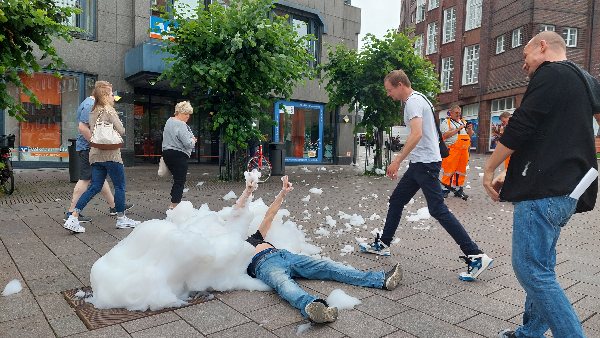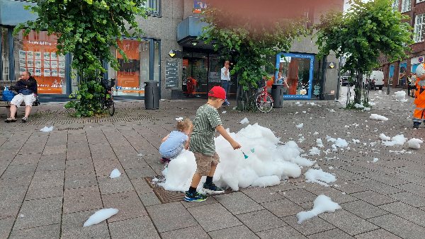 (tbf) Es war schon lustig anzusehen, was sich ein paar junge Leute auf dem Klingenberg in Lübeck einfielen ließen: Sie hatten, so erzählte ein junger Mann, Bio Waschmittel bei Rewe gekauft und in den Wasserkreislauf der Wasserspiele geschüttet und abgewartet, was passiert. Es dauerte nicht lange, da begann das Waschmittel an zu schäumen und wurde durch die Rohre aus den Straßengullis gedrück und begann, in der Luft herumzufliegen.Kinder rannten zum Schaum, griffen ihn und ließen ihn wieder los, damit er noch höher fliegen konnte. War das ein Spaß für die Kleinen.