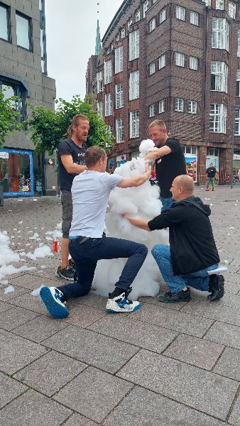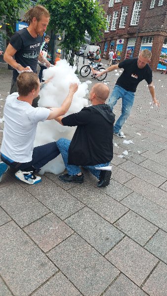Dann rannten 4 junge Männer zum Schaum und wollten jetzt in diesen warmen Tagen einen Schneemann bauen, was nicht wirklich gelang, denn der Schaum fiel immer wieder zusammen. Der untere und mittlere Rumpf klappte noch, aber den Kopf bekamen sie nicht mehr drauf. Spaß hatten sie trotzdem und amüsierten sich köstlich.