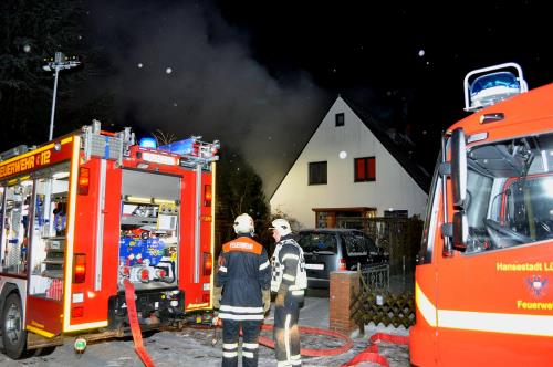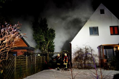 Text: hanseatic-news – Fotos: TBF/Holger Kröger – Lübeck- Dienstagmorgen gegen 4 Uhr brannte im Stadtteil Moisling in der Straße Neuland ein Schuppen zwischen zwei Einfamilienhäusern. Schon von weitem konnten anrückenden Kräfte den Feuerschein sehen. Beim Eintreffen stand ein Schuppen in Flammen. Sofort began die Einsatzkräfte mit den Löschmaßnahmen und konnten so ein Übergreifen in die Dächer verhindern. Die Bewohner konnten sich rechtzeitig aus dem Haus retten.