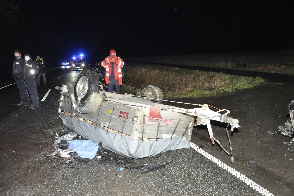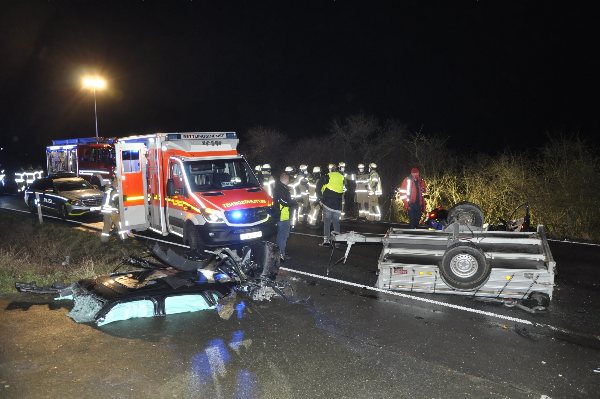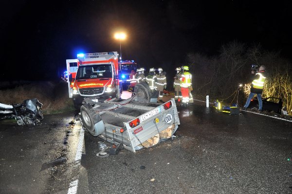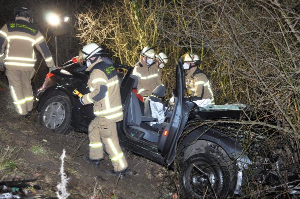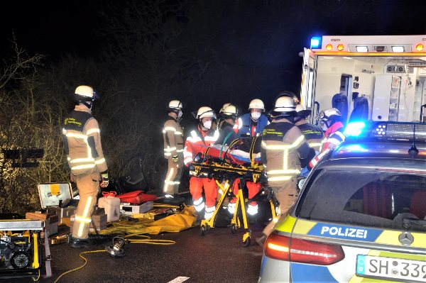 Fotos: TBF/Holger Kröger · Text: STA & Polizei · Am 02. Februar 2022 kam es gegen 18:20 Uhr zu einem schweren Verkehrsunfall auf der B 75 zwischen Reinfeld und Bad Oldesloe. Nach derzeitigem Erkenntnisstand befuhr der 62-jährige Fahrer eines Audi A3 die B 75 in Richtung Reinfeld. Im Bereich einer Linkskurve kam der Fahrer aus noch unbekannter Ursache auf die Gegenfahrbahn und stieß mit einem entgegenkommenden Kia Sorento mit Anhänger zusammen. Der Audi drehte sich und kam rechtsseitig im Knick zum Stehen. Der 62-jährige Fahrer und seine 59-jährige Mitfahrerin wurden im Fahrzeug eingeklemmt. Beide mussten nach der Bergung schwer, aber nicht lebensgefährlich, verletzt in ein Krankenhaus gebracht werden. Der 68-jährige Fahrer des Kia wurde bei dem Unfall leicht verletzt. Der entstandene Sachschaden wird auf 49.550 Euro geschätzt.
