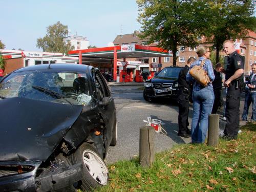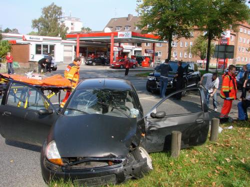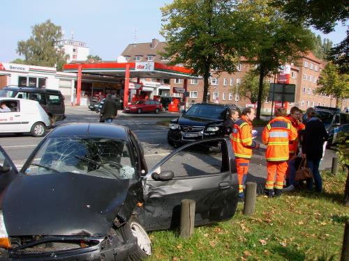 Fotos: TBF/Holger Kröger – Zu einem schweren Verkehrsunfall kam es kurz nach 14 Uhr im Stadtteil Marli, Höhe der ehemaligen Walderseekaserne, gegenüber der Startankstelle. 2 PKWs krachten in einander, die Fahrer der Fahrzeuge wurden schwer verletzt, wurden von Rettungsassistenten und Notarzt versorgt und kamen anschliessend ins Krankenhaus. Die Walderseestrasse wurde ab der dortigen Kreuzung von der Polizei für gut 1 Stunde voll gesperrt.