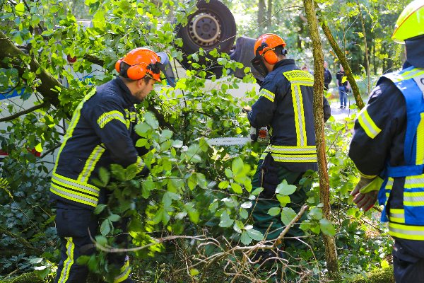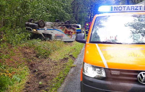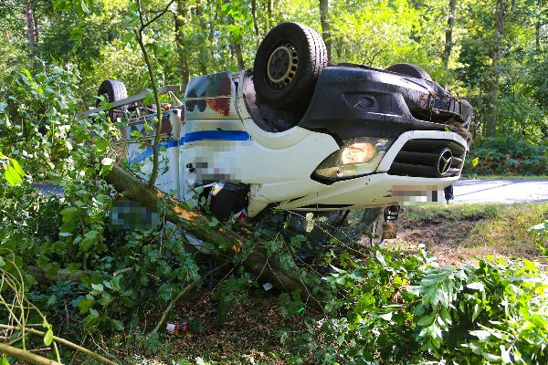 Ort: Apsdorfer Straße, Kreis Steinburg · Datum: 16.9.2022, gegen 12.30 Uhr · Fotos und Text: Thomas Nyfeler · Kühlfahrzeug im Straßengraben – Fahrer schwerverletzt. Kreis  Steinburg – (Thomas Nyfeler) Zwischen den Orten Willenscharen und Arpsdorf ereignete sich gegen 12.30 Uhr am Freitagmittag ein schwerer Unfall ohne Fremdbeteiligung mit einer beteiligten Person. Ein Verkaufsfahrzeug eines Tiefkühlhändlers war aus noch ungeklärter Ursache auf die Gegenspur, von dort aus über das Bankett  in den Graben neben der Straße geraten. Dort stieß es mit einem Baum zusammen, wurde auf das Dach gedreht und blieb gegen den Baum gelehnt liegen. Die alarmierten Freiwilligen Feuerwehren aus Arpsdorf und Padenstedt, welche zuerst an dem Unfallort eintrafen, befreiten den Mitte Zwanzig Jahre alten Fahrer aus dem  Auto und leisteten vorbildliche Erstehilfemaßnahmen. Von der Besatzung der anschließend eintreffenden zwei RTWs und des NEFs der Berufsfeuerwehr Neumünster wurde der schwerverletzte Mann in den Schockraum des FEK gebracht und dort weiter versorgt. Zusätzlich unterstützt von dem Rüstzug der Berufsfeuerwehr Neumünster wurde noch ein beschädigter Baum gefällt, die Bergungsarbeiten des Unfallfahrzeuges wird wegen der Ladung noch eine längere Zeit in Anspruch nehmen. Die Straße zwischen Willenscharen und Arpsdorf ist weiterhin komplett gesperrt. Am Unfallauto entstand ein Totalschaden, die genaue Schadenshöhe, sowie die Unfallursache wird noch ermittelt.