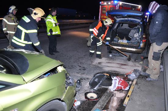 Fotos: TBF/Holger Kröger – Ratzeburg (ots) – Mehrere Menschen wurden bei einem Unfall gestern Nachmittag auf der BAB 1 im Autobahnkreuz Lübeck verletzt. Nach aktuellem Ermittlungsstand war auf der Parallelfahrbahn in Richtung Hamburg der 46- jährige Fahrer eines Fiats aus Bulgarien, aufgrund einer Reifenpanne gegen 17.20 Uhr, liegengeblieben. In dem Wagen saßen noch zu der Zeit seine vier Bekannten (4 Männer- 28, 52 und 2x 39 Jahre alt aus Bulgarien). Nach bisherigen Erkenntnissen soll der Fiat nur sehr unzureichend abgesichert gewesen sein. Der 46- jährige war ausgestiegen und hielt sich im Bereich des Kofferraums auf. In diesem Moment wollte ein 30- jähriger Ratzeburger mit seinem Seat von der BAB 1 aus auf die BAB 20 in Richtung Rostock abfahren. Er sah plötzlich das möglicherweise unbeleuchtete Pannenfahrzeug und bremste stark ab. Der 28- jährige Fahrer eines VW-Golf aus dem Bereich Stormarn erkannte offenbar diese Situation zu spät und prallte auf das Heck des Seat. Der Seat wurde dadurch auf das Pannenfahrzeug geschoben. Der 46- jährige wurde von dem Seat erfasst und schwer verletzt. Zu seinen Verletzungen ist bekannt, dass ihm ein Unterschenkel amputiert werden musste und das andere Bein gebrochen war. Der 30- jährige zog sich einen Brustbeinbruch zu. Die beiden Männer mussten schwer verletzt mit Rettungswagen in die Klinik gebracht werden. Der 28- jährige trug einen Schock davon und wurde leicht verletzt ins Krankenhaus gebracht. Die anderen vier Männer aus Bulgarien blieben unverletzt. Der Gesamtschaden wird auf ca. 30.000 Euro geschätzt. Die Beamten des Polizei- Autobahn- und Bezirksreviers Bad Oldesloe sperrten die Autobahn in dem Bereich für etwa 45 Minuten voll ab. Danach folgte eine halbseitige Sperrung für ca. 2,5 Stunden. Die Ermittlungen zu dem Unfall dauern zurzeit noch an. Sonja Kurz Pressestelle Rückfragen bitte an: Polizeidirektion Ratzeburg PD Ratzeburg, Pressestelle Sonja Kurz Telefon: 04541-809 2010