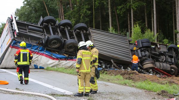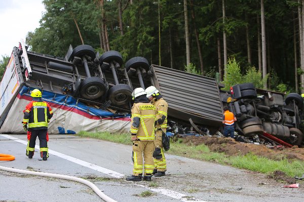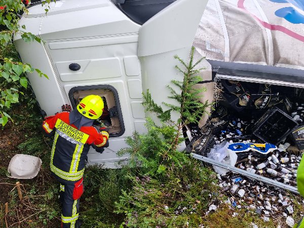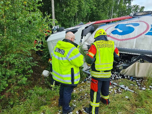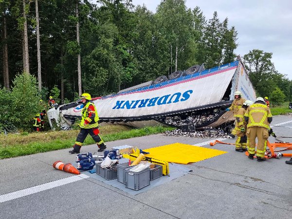 Die junge Frau, musste in Deckung gehen, als der LKW ihr Auto touchierte, da Teile durch die Luft flogen.Durch den Unfall kippte der Lkw auf die Seite und blieb im Grünstreifen liegen. Laut Feuerwehr war der Fahrer des Sattelzugs nicht eingeklemmt sondern in seinem Kabine eingeschlossen und musste von der Feuerwehr aus dem Fahrzeug befreit werden. Der Mann wurde leicht verletzt. Der Stau durch die Sperrung auf A7 dauert noch mehrere Stunden ca. bis 16 Uhr an. Die Autobahn musste ab Großenaspe in Richtung Süden komplett gesperrt werden, der Verkehr wird an der Anschlussstelle Großenaspe von der A 7 abgeleitet. Der LKW wird mit einem Kran aufgerichtet werden und die leeren Bierflaschen entnommen. Über die Höhe des Sachschadens liegen noch keine Erkenntnisse vor.