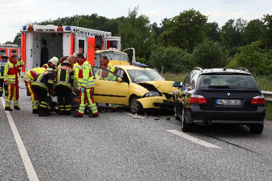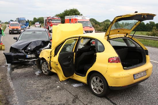 Foto_THomas_Nyfeler_VUPKL_B205_01Text und Fotos: Maria Heidecke (mhe) – Neumünster (mhe) – Auf der B205 Neumünster in Richtung A7 ereignete sich gegen 16:50 Uhr am heutigen Mittwoch ein schwerer Verkehrsunfall mit drei beteiligten PKWs. Ein Seat aus dem Kreis Ostholstein fuhr in Richtung Bad Segeberg und kam aus noch ungeklärter Ursache auf die Gegenfahrbahn. Ein VW Touran aus Hamburg und ein BMW aus Lübeck konnten nicht mehr rechtzeitig ausweichen. Foto_THomas_Nyfeler_VUPKL_B205_03Der Seatfahrer musste aus dem Auto befreit werden, wurde vor Ort vom Notarzt versorgt und mit lebensbedrohlichen Verletzungen ins FEK nach Neumünster gebracht. Die beiden anderen Beteiligten wurden leicht verletzt und ebenfalls vom Rettungsdienst ins Krankenhaus gefahren. Die Berufsfeuerwehr Neumünster streute auslaufende Betriebsstoffe ab. An allen drei Autos entstand ein Totalschaden. Die Polizei sperrte die B205 vollständig und leitete den Verkehr um.Foto_THomas_Nyfeler_VUPKL_B205_02
