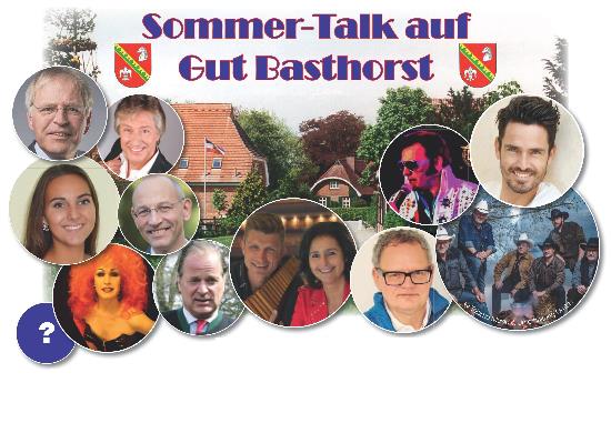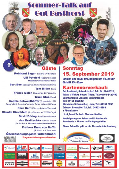 Sommertalk auf Gut Basthorst am Sonntag, 15. September 2019 · Text: Christine Gebauer und Holger Kasnitz · Am Sonntag 15. September 2019 ist es wieder soweit, der beliebte Sommertalk auf dem wunderschönen Gut Basthorst, Auf dem Gut 3. Mit vielen interessanten Gästen, geht in die 10. Runde. Gern unterstützen wir wieder das „Kinderhospiz Sternenbrücke“ in Hamburg. Wir freuen uns sehr auf die Country Legenden „Truck Stop“. Landrat Reinhard Sager wird erwartet, die Top Organistin an der Wersiorgel, Claudia Hirschfeld, begleitet wird sie von dem  Panflöten-Virtuosen David Döring. Aus der RTL Show „Supertalent“ die Sopranistin Sophie Schwerthöffer, die für Gänsehaut- Feeling sorgen wird. Entertainer Bert Beel aus Berlin, Elvis, alias Tom Miller, mit Sounds of Elvis. Die Lachmuskeln werden garantiert strapaziert, wenn der Superstar der Travestie, France Delon, die Bühne betritt.