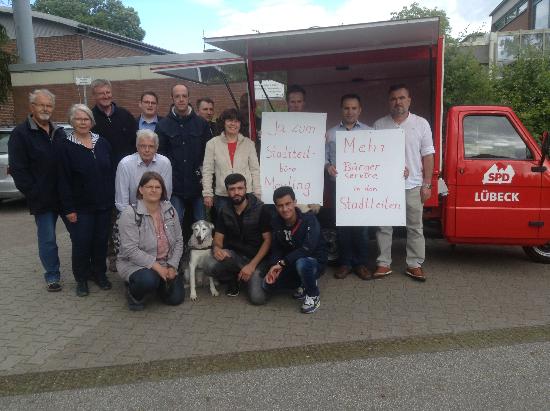 SPD: Demo in Moisling für Stadtteilbüros · Am Freitag zeigten die Bürger am Moislinger Berg, dass Ihnen die Wiedereröffnung ihres Stadtteilbüros wichtig ist. Der SPD-Ortsverein Moisling organisierte die Kundgebung. Trotz der sehr kurzfristigen Ankündigung von nicht einmal 24 Stunden kamen etwa 35 Teilnehmer. Von den benachbarten SPD-Ortsvereinen Buntekuh und St. Lorenz Nord erschienen deren Vorsitzende Sebastian Oelkers und Marek Lengen. Ebenfalls zeigten sich Thomas Misch, Gregor Voht und Detlef Stolzenberg.