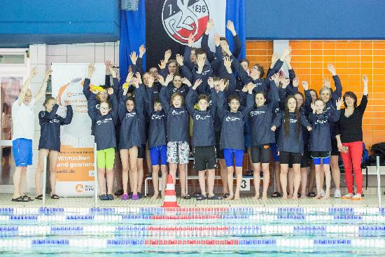 Bildunterschrift: Die Schwimmerinnen und Schwimmer der SG Lübeck freuen sich über die neue einheitliche Sportbekleidung.