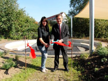 Foto und Text Thomas Dumke: Bürgermeister Bernd Saxe und Schulsprecherin Ann-Christin Dumke eröffnen den neuen Schulhof, in dem sie ein rotes Band durchschneiden.