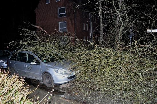 Text: TBF/Dieter Maas – Fotos: TBF/Holger Kröger – Aufgrund der strarken Sturmböen in Lübeck kippte heute Morgen gegen 5:00 Uhr ein Baum mit einem Durchmesser von ca. 50 cm auf die Stralsunder Straße, Ecke Hansering auf die Fahrbahn. Ein Teil des Baumes landete auf einem Pkw. Außerdem wurde ein Verkehrsschild beschädigt.Einige Anwohner, die zur Arbeit wollten, konnten aus der Sackgasse Stralsunder Straße mit ihrem Pkw nicht mehr herausfahren. Die Berufsfeuerwehr Lübeck zersägte den Baum und räumte die Fahrbahn und den Bürgersteig schnell wieder frei. Die Aktion dauerte ca. eine halbe Stunde.