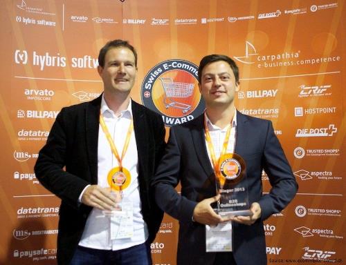 Bildunterschrift: Herr Kaspar Geiser (Aspecta) und Herr Yevgenij Pisetsky (E-Commerce Manager von Rajapack) freuen sich über den Swiss E-Commerce Award für den besten B2B Online-Shop 2013.