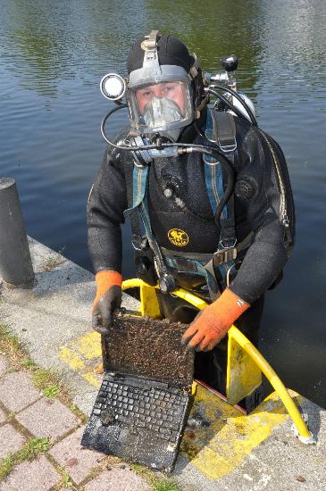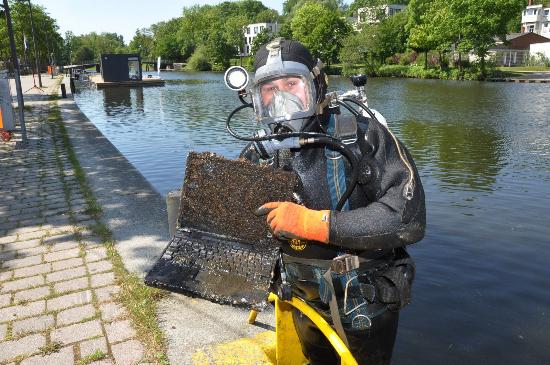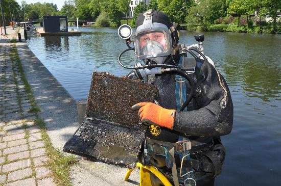 Lübeck Lupe Taucher finden Laptop 14. Mai 2018 TBF Text und Fotos: TBF/Holger Kröger – Taucher Andreas Ulbricht (4) von der Taucherfirma Hock ist von der Hansestadt Lübeck beauftragt worden, Bauwerksuntersuchungen an der Kaimauer vorzunehmen. Dabei entdeckte er auf dem Grund ein Laptop.
