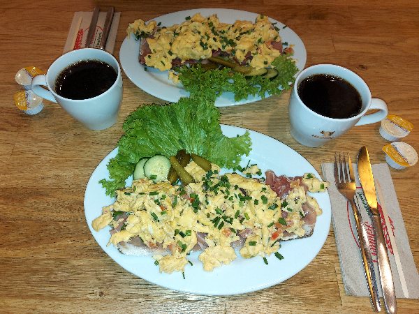 Das Ambiente im Verkaufsraum hell und freundlich, alles rundherum war sauber und ordentlich, vorne kauften die Leute Brötchen, Kuchen, Torten und andere Leckereien und an den Seiten, sowie weiter hinten im Raum stehen die Tische und Stühle bzw. Sitzbänke.Als wir dran waren, bestellten wir zwei „Stramme Schüler“ – im Volksmund „Strammer Max“, sie bestanden je aus einer großen Scheibe Schwarzbrot, darauf eine Scheibe geräucherter Schinken und das Rührei wurde auf unser Bitten gleich mit Tomate, Schnittlauch, Zwiebel, gemischt, Salatgurke, Cornichons und ein paar kleine Blätter Salat waren als Deko nett daneben angerichtet. Dazu bestellten wir je einen Becher Kaffee. Milch, Pfeffer und Salz gab es auf einem Tablet extra gereicht.