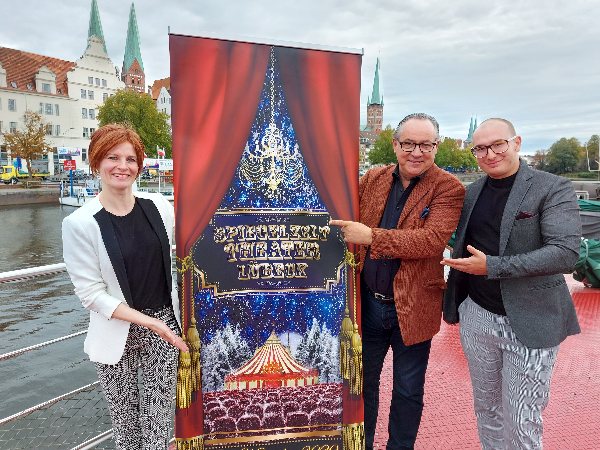 Text und Fotos: TBF/Holger Kasnitz · Flexibilität nicht nur wegen Coronazeiten, aber nun verlagert das Theaterschiff Lübeck seinen Betrieb für drei Monate in ein Spiegelzelt, das Ende Oktober auf der Wiese vor der Holstentorhalle aufgestellt wird. Covid-19 zwingt die Kulturschaffenden der Hansestadt, auf neuen Wegen zu wandeln. Und wie so viele, steckt das Team des Theaterschiffs Lübeck ebenfalls seit Monaten in der Krise. „Es ist genug,“ so Knut Schakinnis, Geschäftsführer des Theaterschiff Lübeck (rechts neben dem Aufsteller), und Theaterleiterin Theresa Gebhardt (links) und rechts, ein Mitarbeiter von Schakinnis, – Patrick Leo.„Wir haben eine alte Idee aus der Schublade gezaubert und werden mit einer temporäre Spielstätte, einem Spiegelzelt Vorführungen machen.“ Eine Rekonstruktion aus dem frühen 20. Jahrhundert, die Ende Oktober auf der Wiese vor der Holstentorhalle aufgebaut wird und bis zum 31. Januar 2021 stehenbleibt. „Eigentlich eine Alte Idee, denn solche Zelte standen früher viel auf den Jahrmärkten, “ so Theresa Gebhardt.