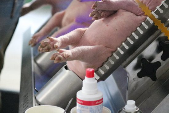 Foto: Isa-Maria Kuhn, Landwirtschaftskammer · Tierwohl: Ab 1. Januar neue Auflagen beim Kastrieren von Ferkeln · Futterkamp zeigte 150 Landwirten heute den Eingriff unter Narkose. Schweinehalter stecken in einer Zwickmühle: Einerseits wird das Kastrieren der Ferkel von Verbrauchen kritisch betrachtet, andererseits möchte niemand Eberfleisch auf dem Teller haben, das unangenehm schmeckt oder riecht. Das kann bei unkastrierten Ferkeln durchaus der Fall sein. Es gibt künftig vier Möglichkeiten, wie betroffene Betriebe im neuen Jahr mit der Problematik umgehen können. Einer davon ist der Eingriff unter Isofluran-Narkose. Den hat die Landwirtschaftskammer am Vormittag in ihrem Kompetenzzentrum für Tierhaltung in Futterkamp in Blekendorf (Kreis Plön) demonstriert.