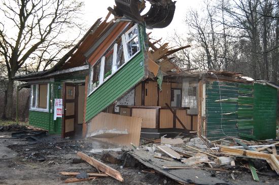 Text und Fotos: TBF/Holger Kröger – Der Imbiss und Kiosk am Straßenrand in der Mecklenburger Straße in Lübeck-Schlutup war Kult. Seit 1961 war die „Grüne Bude“ für Berufskraftfahrer Zwischenstation. Aber auch viele Schlutuper kehrten dort ein. Viele Fernfahrer schickten Postkarten aus aller Welt an den Budenbesitzer.Heute Morgen rollte der Bagger an, um die Tradiotionsbude abzureißen. Da die neue Umgehungsstraße in Schlutup entsteht, lohnt es sich dort nicht mehr die Bude weiter zu betreiben. An gleicher Stelle wird auch nichts neues gebaut, da es sich um ein Naturschutzgebiet handelt.