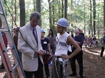 Michael Haukohl, Vorsitzender der Rotary Stiftung zu Lübeck, und Sönke Petersson, erster Vereinsvorsitzender der erlebnispädagogischen Einrichtung, klinken die ersten jugendlichen Teilnehmer symbolisch in die Karabiner ein, bevor sie über ein Kletterseil gesichert in die Höhe steigen.